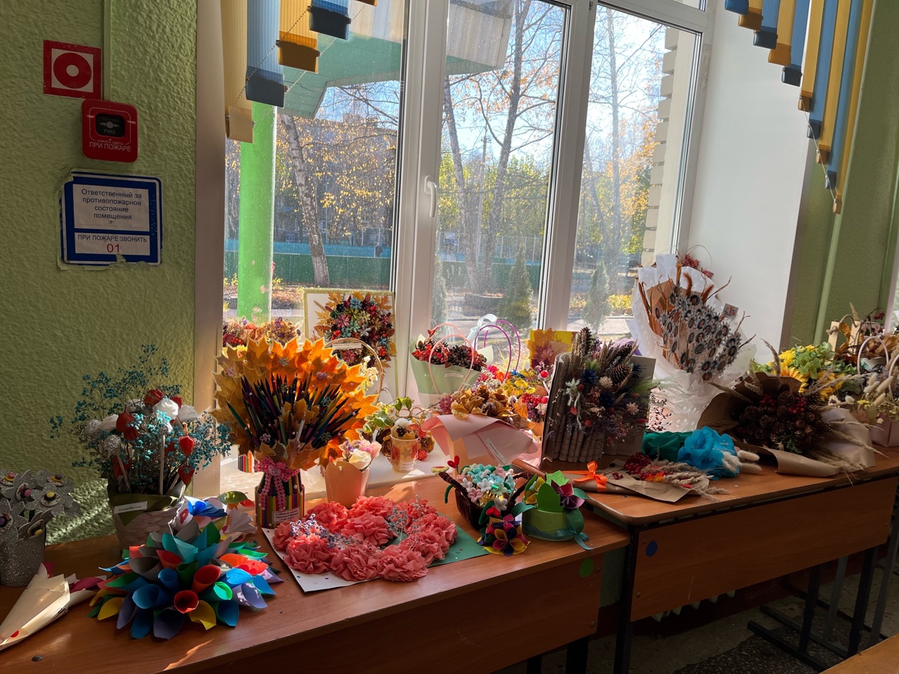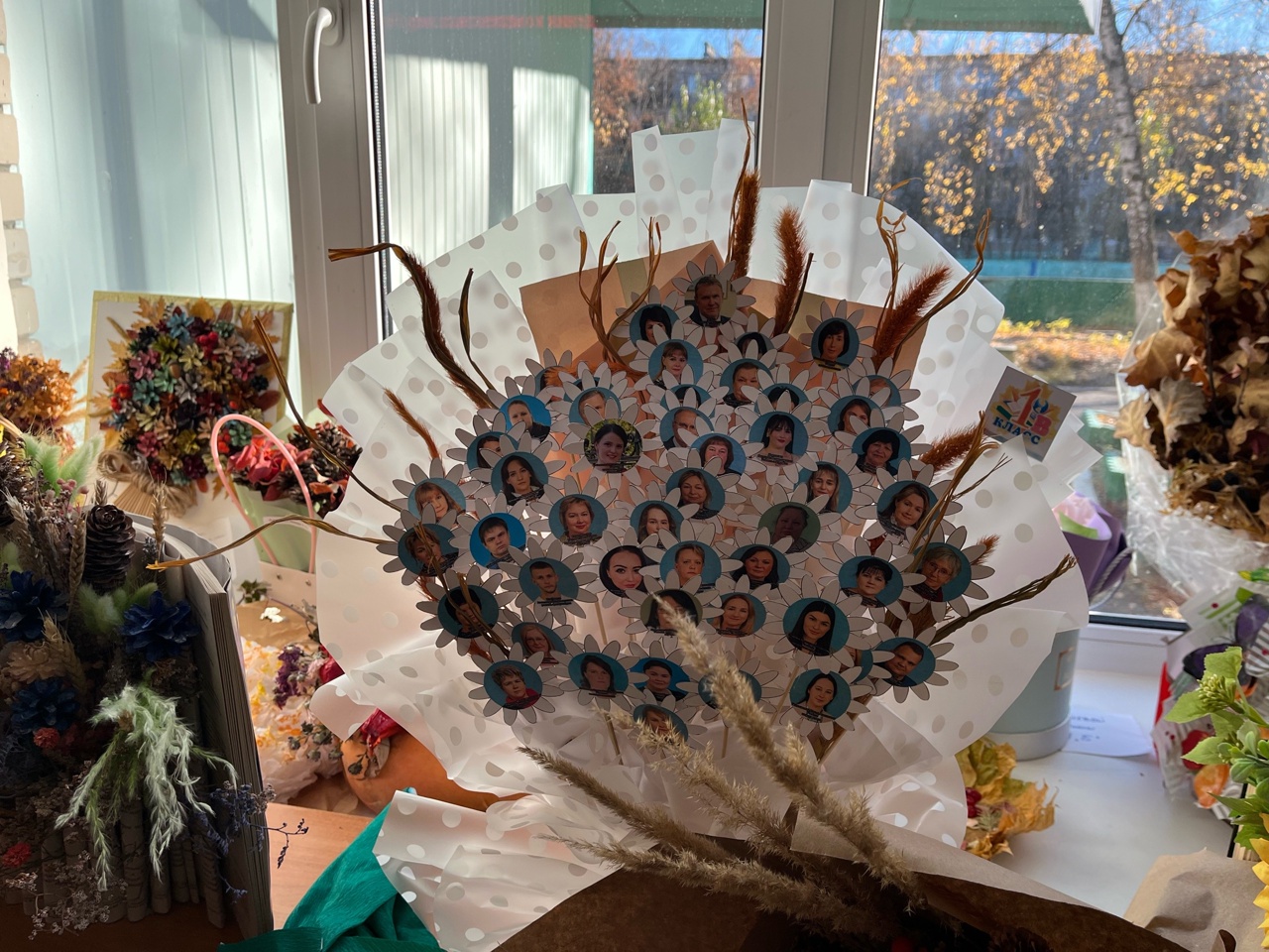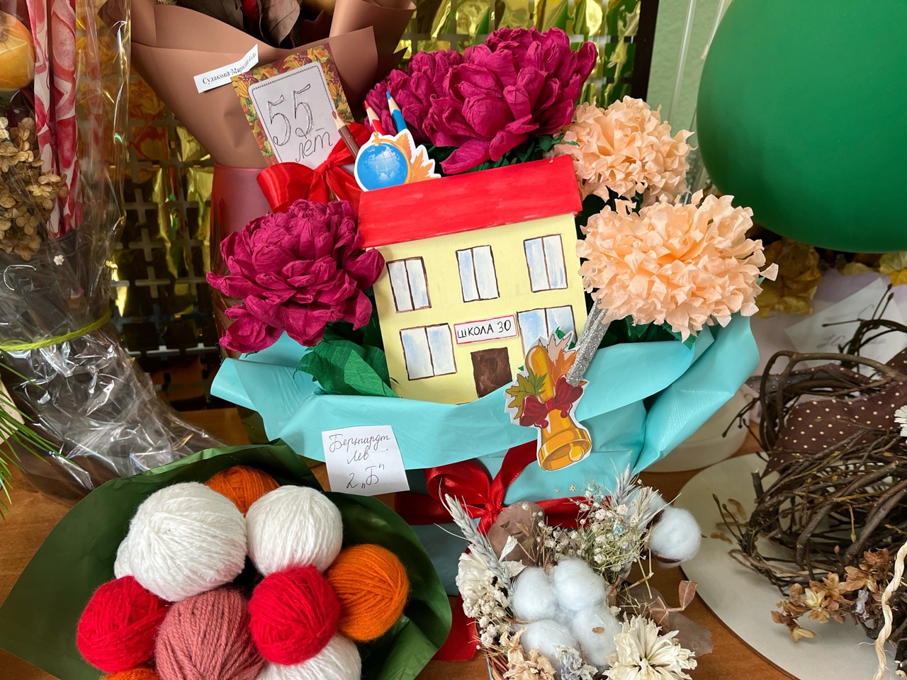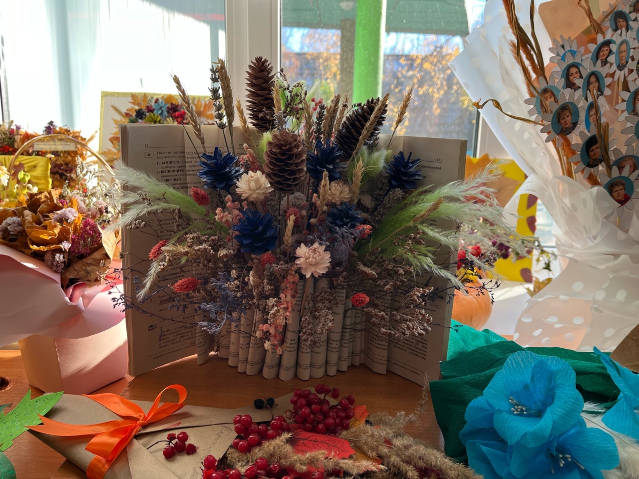 Рядом со стенгазетами расположилась удивительная выставка букетов, созданных руками талантливых ребят и их родителей. Композиции, выполненные из сухих растений, цветных карандашей, лент и даже фотографий поражали воображение своей оригинальностью и выразительностью. Каждый автор стремился сделать особенный подарок школе, выражая искреннюю благодарность и уважение к родному учебному заведению.