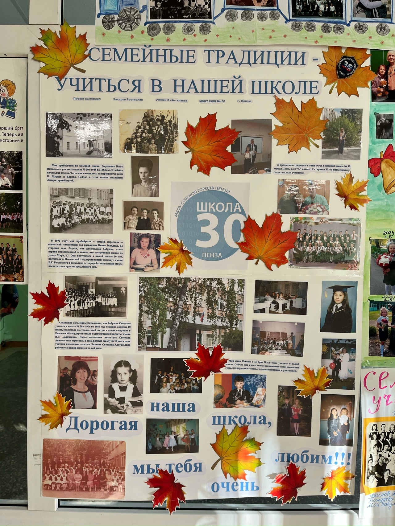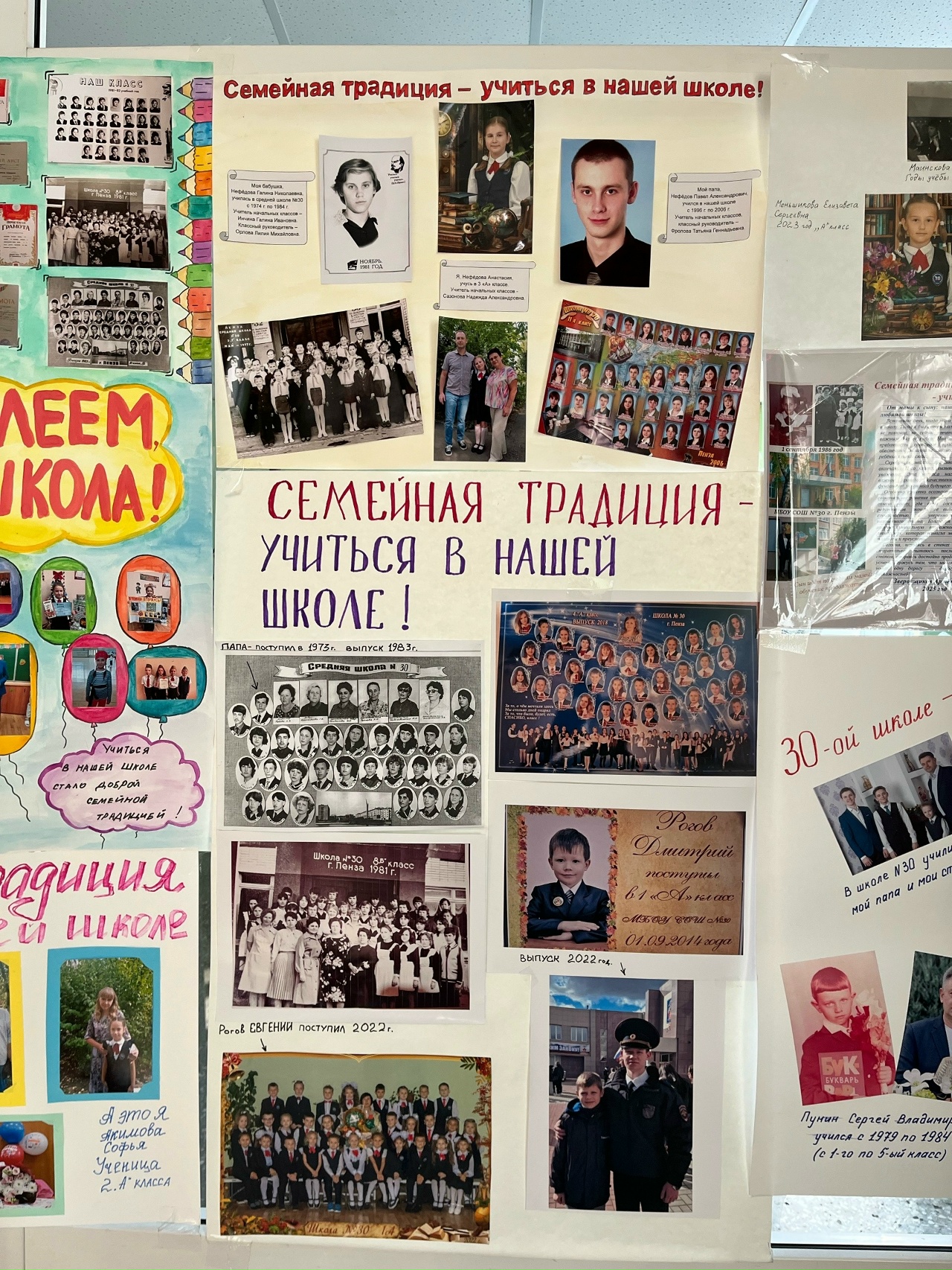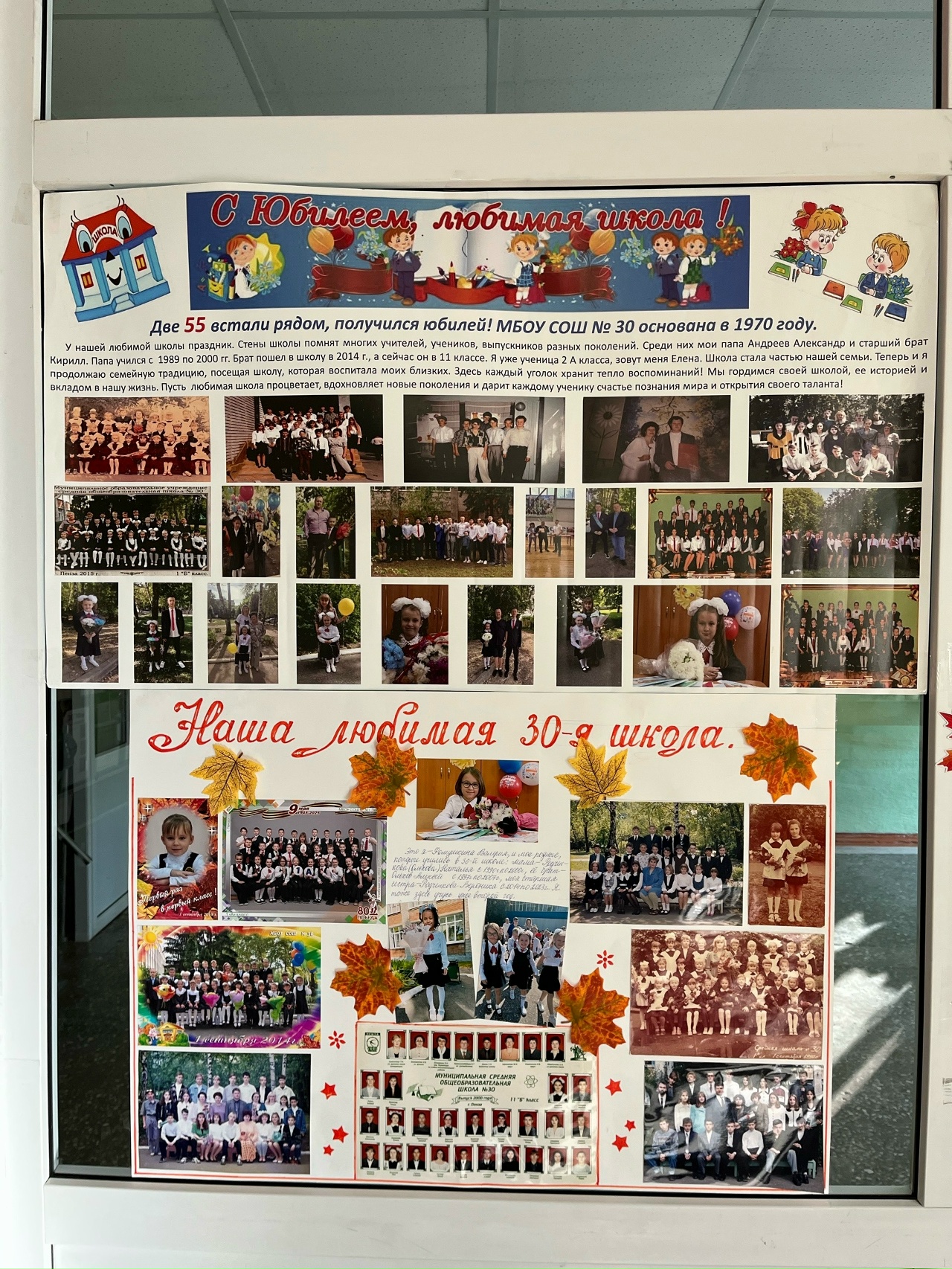 В преддверии торжества первый этаж школы превратился в настоящую выставку творчества учеников и родителей. Были представлены уникальные произведения, рассказывающие историю школы через призму семейных традиций. На стенгазетах, подготовленных в рамках конкурса “Семейная традиция — учиться в нашей школе”, можно увидеть фотографии из семейных альбомов, на которых запечатлены разные поколения учеников школы №30. Эти архивные кадры позволили взглянуть на портреты сегодняшних детей и их бабушек-дедушек в стенах родного учебного заведения. Особое впечатление произвели фотографии, демонстрирующие старые школьные кабинеты и приветливые улыбки бывших школьников.