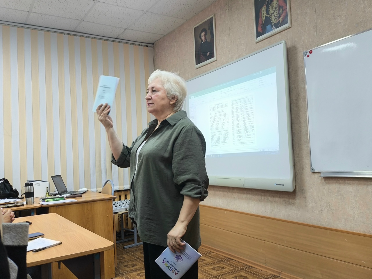 После обсуждения уроков Ольга Викторовна представила направление, которое активно реализуется в школе, – часы внеклассного чтения. Каменева О.В. поделилась с коллегами опытом использования информационных технологий, осуществляющих обсуждение произведений в онлайн-формате. Рассказала о том, что в студии художественного слова учащиеся МБОУ СОШ №30 пишут творческие работы по литературным произведениям, и именно эта работа повышает интерес учащихся к чтению книг. Кроме того, Ольга Викторовна продемонстрировала результаты проектной деятельности, представив слушателям стажировочной площадки сборники стихов, написанных педагогом и самими учащимися, а также литературный календарь за 2026 год, посвящённый писателям, чья жизнь и творчество связаны с Пензенским краем.