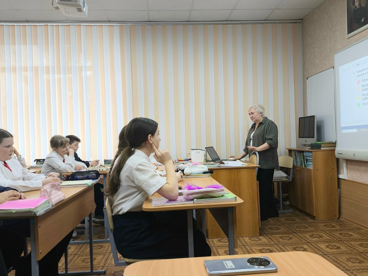 Каменева Ольга Викторовна провела в 5 «В» классе урок русского языка по теме «Неопределённая форма глагола». На занятии ученики прошли тестирование с использованием электронных пультов для голосования (система MimioVote). Затем с помощью мультимедийного оборудования пятиклассники проверили и объяснили каждое задание теста.