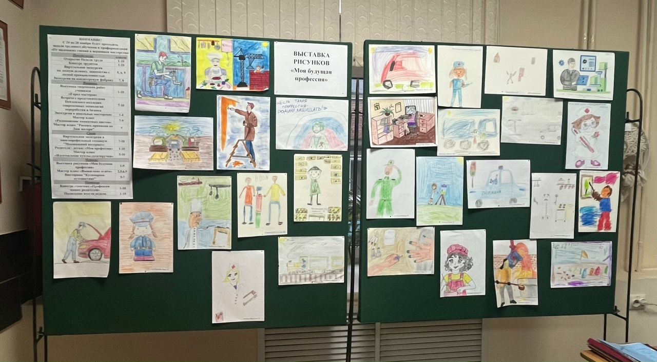 Вместе с тем ребята приняли участие в выставке рисунков на тему «Моя будущая профессия». Ученики пофантазировали о своём будущем, примерили на себя интересующие их профессии, а также профессии своих родителей. Через рассказы о трудовом пути своих близких школьники узнали о разнообразии профессиональных сфер, укрепили семейные связи, задавая родителям вопросы об их карьере.